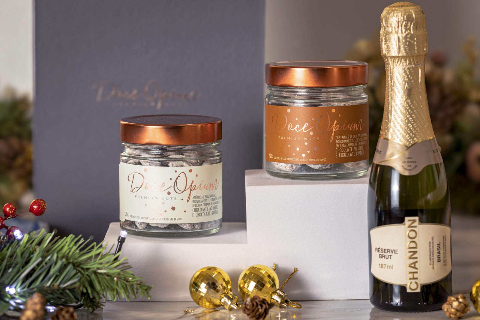 Nesta caixa Doce Opium você encontra: 2 potes de 120g, um com castanhas de caju e outro com amêndoas, ambas individualmente caramelizadas e cobertas com uma delicada camada de chocolate + 1 garrafa de 187ml de Chandon.